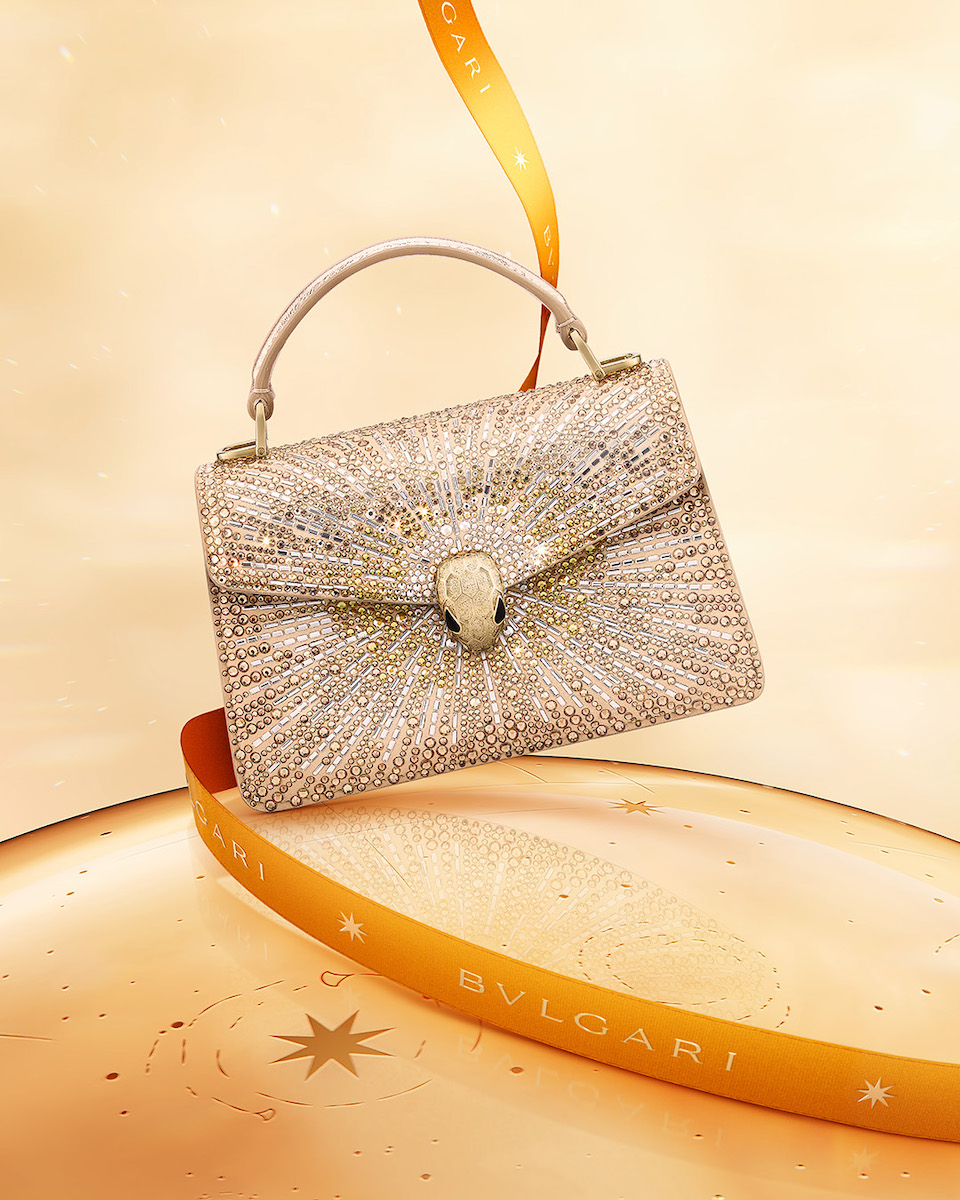 In the world of accessories, the season is celebrated through the Fireworks theme, presented in two dazzling variations. In Fireworks Crystal, the Serpenti Forever Top Handle and Day-to-Night bag is illuminated with 8,348 and 9,581 crystals in nine colors and three sizes, framing the iconic snakehead closure. Fireworks Embroidery is a high-craft creation. The Serpentine Duette small tote in golden calf leather, hand-embroidered with crystals, beads, and sequins, stands as a stunning example of couture artistry. A tribute to Roman boldness and artisanal excellence. The art of gifting extends into the olfactory universe with the Maison’s signature fragrance collections for men and women, presented in festive gold boxes bearing the Bvlgari logo. From the timeless olfactory icons Eau Parfumée Thé Vert and Thé Blanc, to the harmonious refinement of Pour Homme, and the radiant brilliance of Omnia Crystalline, each fragrance infuses the season with emotion. As an exclusive novelty, the Allegra Countdown Calendar transforms the holidays into a journey that continues beyond Christmas Day. Beginning on December 25, it reveals seven exquisite surprises, prolonging the spirit of giving all the way into the New Year.