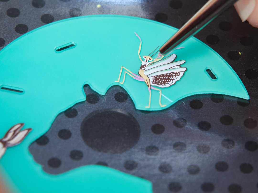 Nothing less is needed to breathe life into the bestiary surrounding it : butterflies, hummingbirds, turtles and peacocks give unique depth to the dial through their hand-engraved and painted gold applique. Next to them, rabbits and praying mantises are miniature-painted in various layers that endow them with subtle depth achieved after five days of artisanal devotion. This playful yet technical composition is framed by a 38 mm rose gold case featuring a bezel set with 82 diamonds.