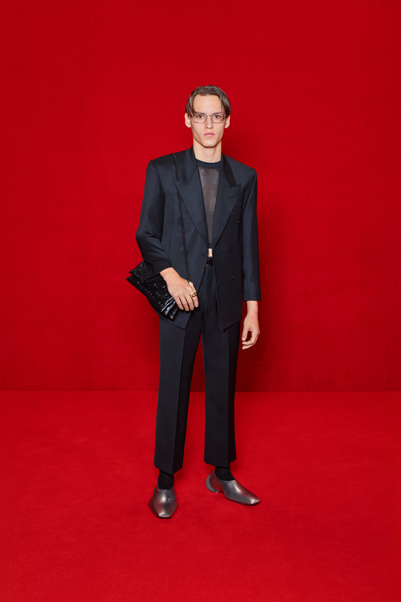 Part of an ongoing collaboration with Crocs, Hard Crocs turn the soft clog into a metal-fortified platform with a cyber goth aesthetic. The Defender is a new super-chunky sneaker with extreme tire tread. Trompe l’œil boots mimic a stiletto sandal worn over a sock. The Cagole Boot is a footwear version of the classic studded bag made in arena leather.