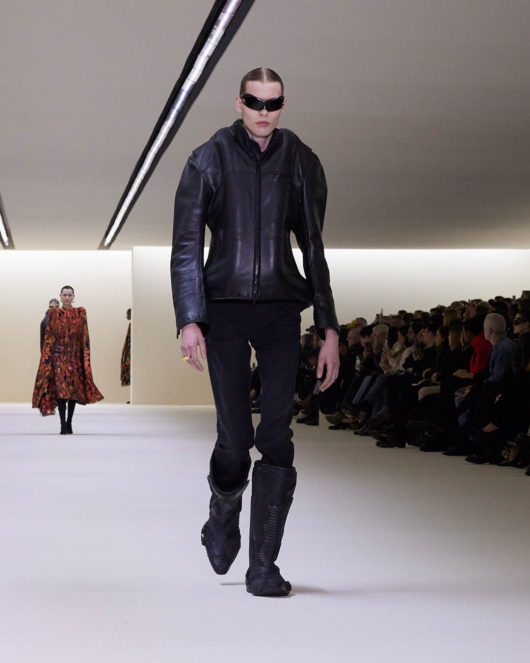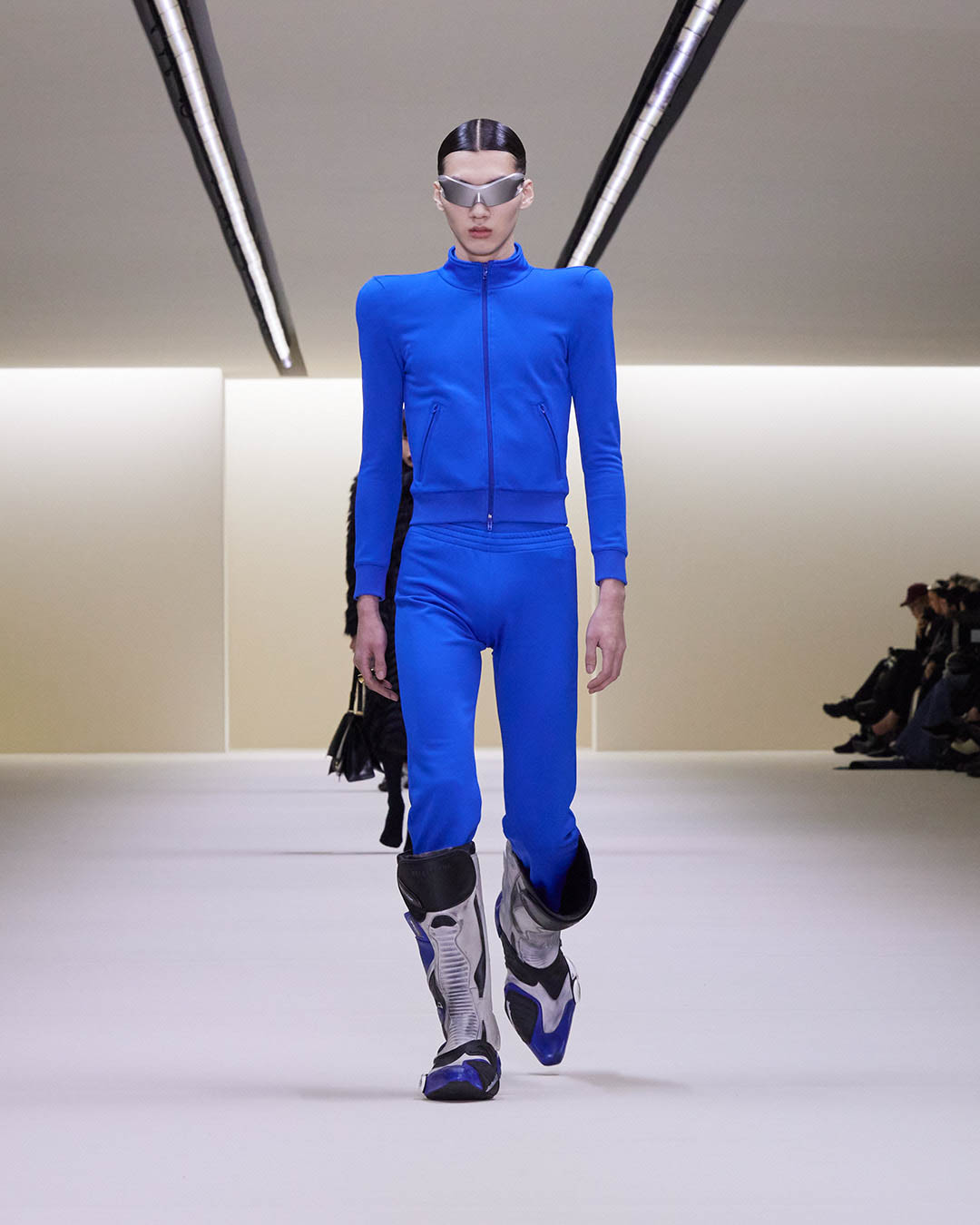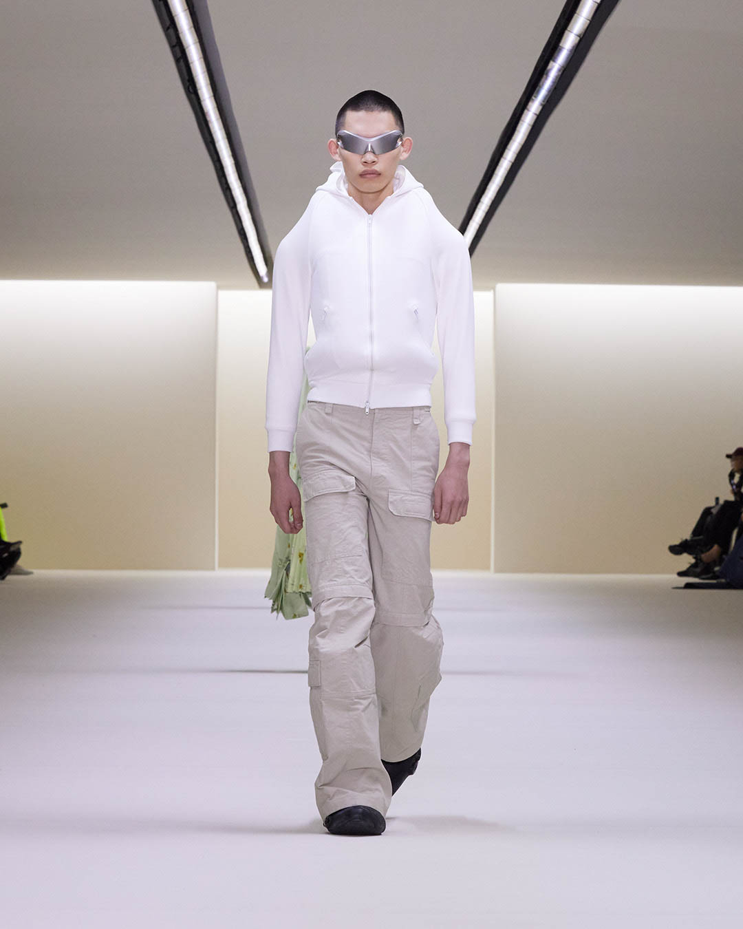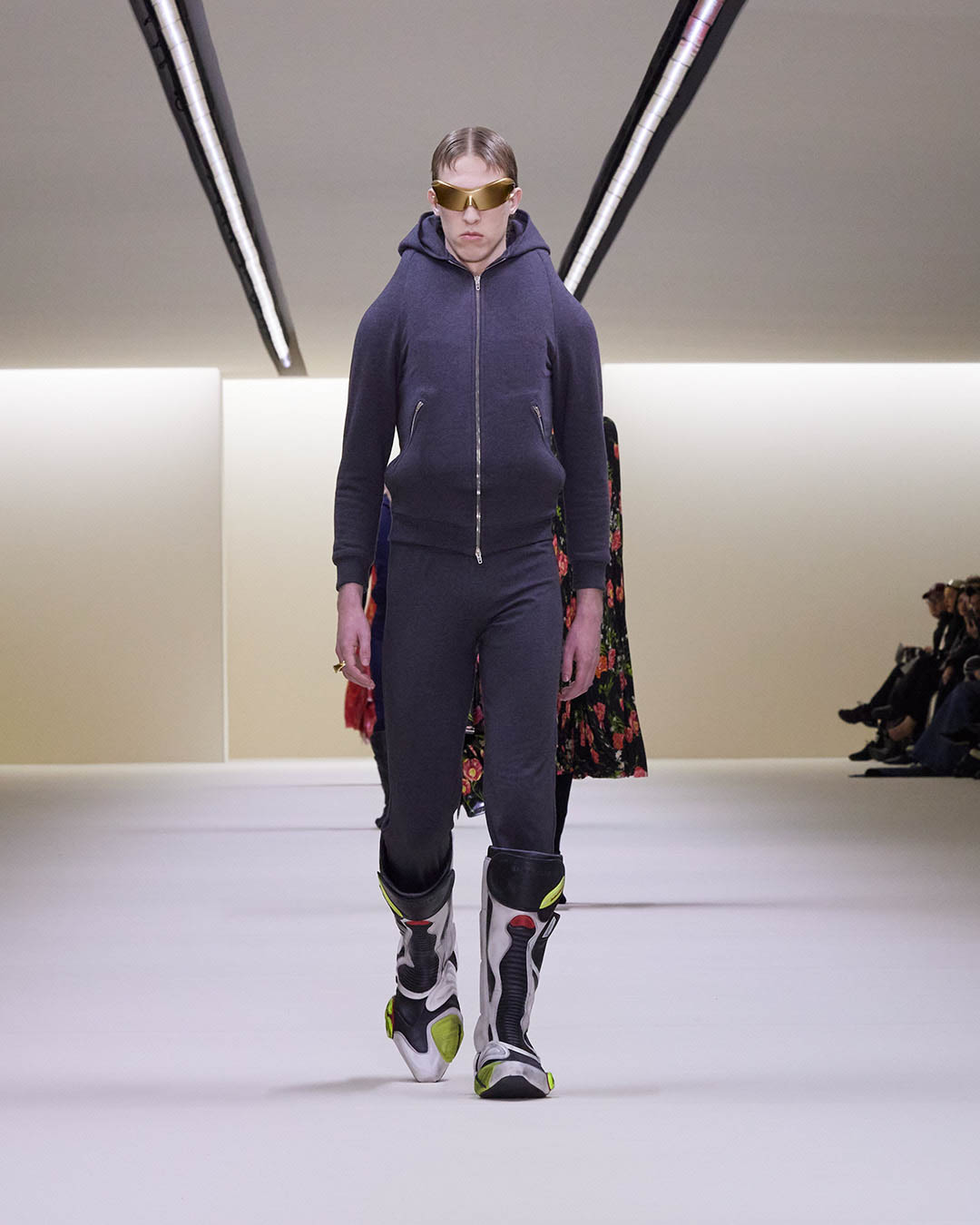 การใช้เทคนิคที่ทำให้ซิลูเอตพองขึ้นผสานกับการตัดเย็บของซับใน เสื้อฮู้ดมีซิป แจ็คเก็ตไบค์เกอร์ แทร็คสูท และพัฟเฟอร์ ซึ่งได้รับการรังสรรค์ขึ้นใหม่และเปลี่ยนมิติของรูปทรงโดยอ้างอิงจากกีฬาผาดโผน