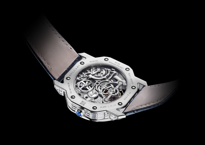 Nothing has been spared in implementing Bulgari’s many skills. First of all, the movement: the white gold elements forming the structure of the movement have all been skeletonised, i.e. reworked in order to remove as much precious material as possible. This is a delicate art, as the components must retain their rigidity and load-bearing capacity. They have in addition been extensively decorated by hand.