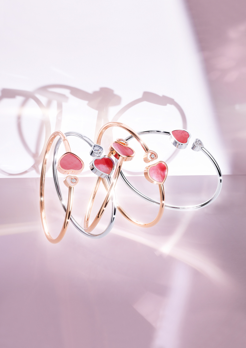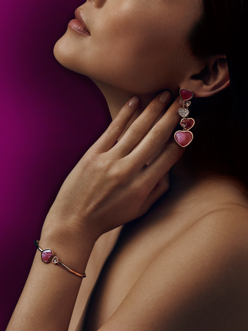 So much more than just a jewellery collection, Happy Hearts symbolises Chopard’s boundless generosity and creativity. It is infused with the vibrant energy of the Maison’s heart emblem beating in unison with the causes dear to Caroline Scheufele. A joyful and infinitely chic edition of the Happy Hearts bangle – crafted in ethical 18-carat rose or white gold and pink mother-of-pearl – is dedicated to Chopard’s support for the Naked Heart Foundation, the charity Natalia Vodianova launched in 2004 to help underprivileged children.