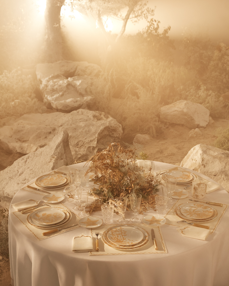 As the holidays approach, Dior Maison unveils a new line of extra fine Limoges porcelain. Enhanced with golden hues, two sets of dinner and dessert plates are adorned with sketches by the artist Pietro Ruffo for the Dior 2022 cruise collection designed by Maria Grazia Chiuri. The founding couturier's lucky star and enchanted flora constellate this service, as well as a dish and a bread plate. As a final surprise, a selection of matching objects including notebooks, mini candles, teas, a vide-poche tray, placemats, and Christmas ornaments enrich the collection. A celebration of the season's magic and the savoir-faire the House treasures.