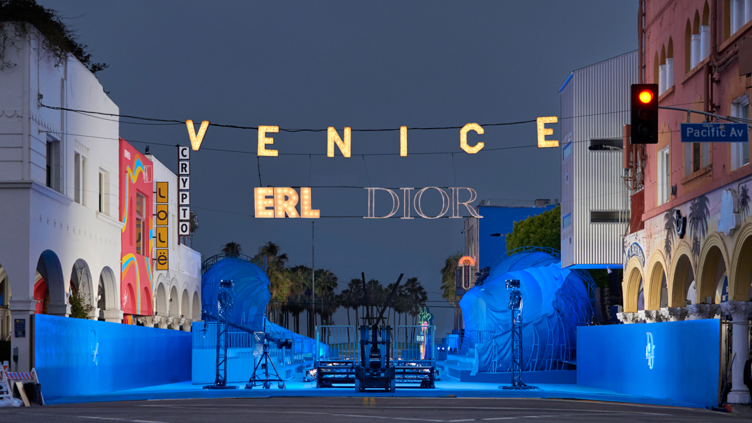 A SPRING EVENING ON WINDWARD AVENUE IN VENICE BEACH, CALIFORNIA. HERE, ON AN ICONIC STREET SO FAMILIAR FROM THE WORLD OF FILM, ART, LIFE AND FASHION ARE INTERTWINED IN AN UNPRECEDENTED CREATIVE DIALOGUE BETWEEN KIM JONES AND ELI RUSSELL LINNETZ, ERL'S CREATIVE DIRECTOR AND GUEST DESIGNER FOR THIS COLLECTION. SILHOUETTES ARE REVEALED, UNITING THE SAVOIR-FAIRE OF PARISIAN HAUTE COUTURE WITH CALIFORNIAN CULTURE. A SLOUCHING, EASEFUL, EVERYDAY SENSIBILITY BELIES THE PRECISION OF TAILORING AND MASTERY OF FABRIC IN THE ATELIERS DIOR. THE HOUSE’S CLASSICS ARE REINVENTED: CANNAGE IS TRANSFORMED INTO QUILTING - SATIN AND LEATHER - ON SKATE SNEAKERS OR CRYSTAL-ENCRUSTED TROUSERS. AT THE CROSSROADS OF HISTORICAL AND CONTEMPORARY ERAS, THE PIECES REVISIT SOME OF THE HOUSE'S ARCHIVES - NOTABLY THOSE OF GIANFRANCO FERRÉ - FROM THE BAR JACKET TO ACCESSORIES. AN EXCITING RENAISSANCE OF CLASSIC DIOR STYLES.