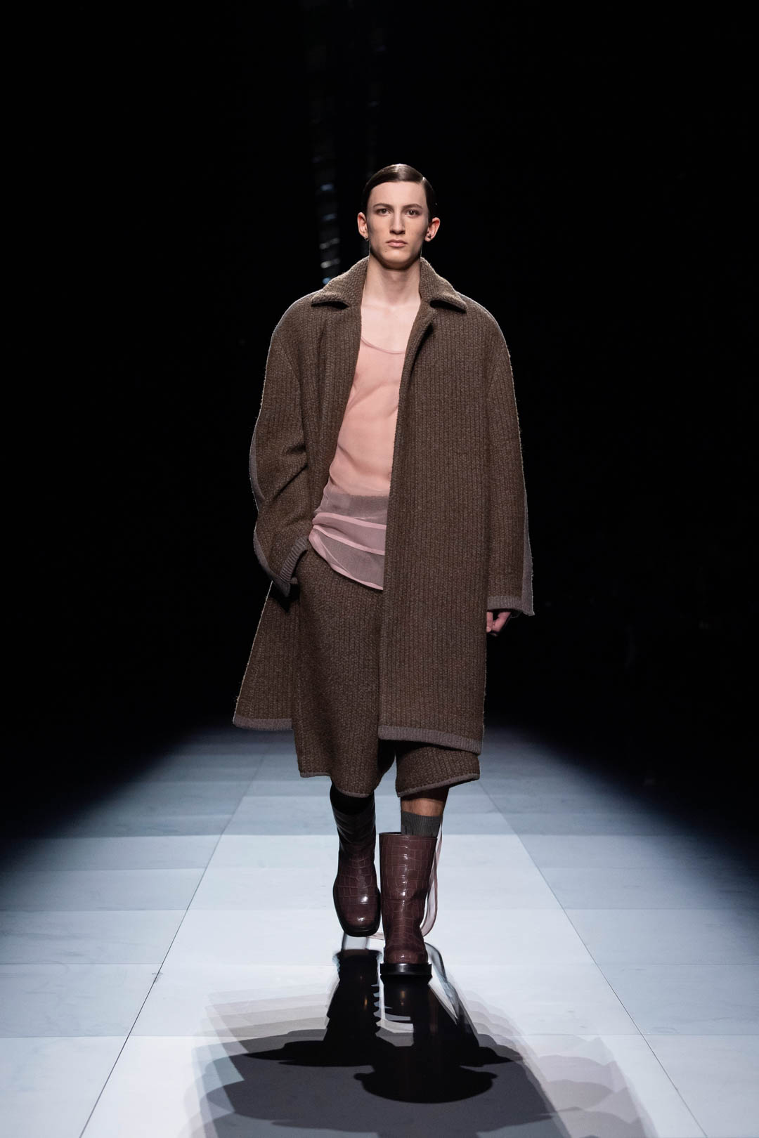 At times garments are taken directly from the archive, transposed and transformed: the sailor top from Mr Saint Laurent’s 'Marine' ensemble is loosened in cavalry twill and also becomes an elongated fisherman's smock; the off-the-shoulder tailoring of 'Acacias' adapted with slouching insouciance for masculine wool suiting, part of a new recurring silhouette and ensemble; the 'Passe Partout' coat with its loosely tied neck now cocoons in a new slubbed, Donegal tweed with the addition of zipped open sleeves. At the same time, the traditional vernacular language of knits is subverted through a sculptural approach to styling and draping together with a melding of tailoring. In counterpoint, startlingly new pieces such as 3D printed shoes and boots, and archetypal sea-faring utilitarian outerwear extend the reach of the house’s savoir-faire to an unprecedented contemporary level. Meanwhile, bags primarily take on an idea of discretion, elegance and precision, stripped of extraneous elements with a box construction in Vernis – an echo of Mr Saint Laurent’s striving for modern simplification.