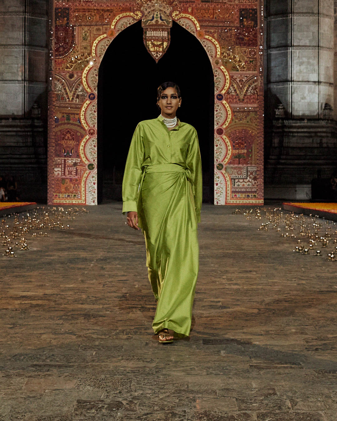 Maria Grazia Chiuri has chosen color palettes and materials that crystalize key influences shared with Karishma Swali of Chanakya. The Creative Director of Dior women’s collections works on timeless clothing forms that have stayed intact through time, allowing her to (re)design her favorite models. A color block sequence dedicated to silks – in shades of green, yellow, pink and purple –, in homage to Marc Bohan, is embodied by sophisticated evening coats, sari-inspired straight skirts and traditional Indian cuts, as well as pants, boleros, jackets and tops: a veritable sartorial genealogy defined by different heritages and fashion cultures.