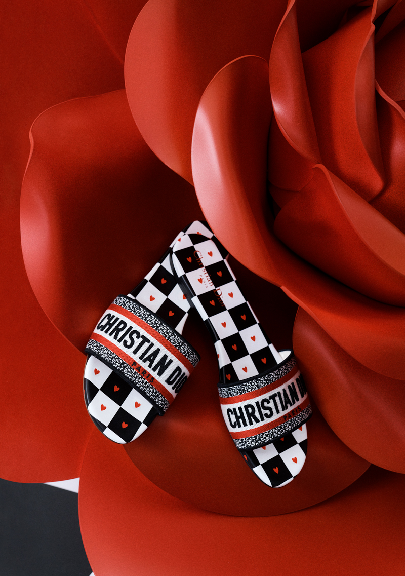 Inspired by the world of fairy tales, the Dioramour creations by Maria Grazia Chiuri are an invitation to escape and play. Punctuated with hearts, the D-Chess check print and the D-Royaume d'Amour motif celebrate tender sentiments, adorning emblematic House designs such as Dior Addict sneakers and the Dior Book Tote. The Lady Dior and Dior Caro bags as well as small leather accessories also come in a new heart-shaped cannage version specially designed for this capsule, a reflection of innovative savoir-faire. Sweaters, a t-shirt, a silk scarf and a bob hat complete these exceptional looks. Dior Maison essentials such as plates, mugs and candles are also dressed in the colors of the collection. These objects of desire may be discovered in Dior boutiques from July.