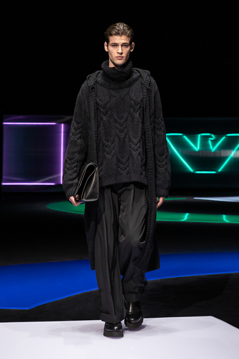 ในส่วนของเสื้อผ้าสำหรับผู้ชายนั้น ความอ่อนนุ่มได้ถูกตีความผ่านรูปทรงและฟังก์ชั่นในแบบใหม่ โครงร่างจะถูกเพิ่มความพลิ้วไหวและผ่อนคลาย เสื้อแจ๊คเก็ตจะมาพร้อมขนาดที่กว้างและไหล่ที่ลู่ลง เดินเส้นบริเวณขอบเสื้อด้านในด้วยขน เพื่อให้สามารถใช้แทนเสื้อโค้ทได้ ในขณะที่เสื้อโค้ทซึ่งถูกตัดเย็บหรือทออย่างประณีตด้วยผ้านิตจะช่วยให้รู้สึกสบายและอบอุ่นราวกับสวมชุดคลุมตัวยาว เพื่อความคล่องตัว ช่วงลำตัวของเสื้อจะถูกเพิ่มความเพรียวเพื่อให้ง่ายต่อการเคลื่อนไหว กางเกงที่ตัดเย็บจากผ้าเนื้อนุ่มจะถูกเพิ่มลูกเล่นด้วยการพับขาและเอวสูงที่เข้ารูปไปกับช่วงตัว นอกจากนี้ Emporio Armani ยังได้รับแรงบันดาลใจมาจากชุดนอนที่มากไปด้วยความหรูหรา ซึ่งก่อให้เกิดเสื้อเบลเซอร์ไร้ปก ที่เหมาะแก่การสวมเป็นเสื้อแจ็คเก็ตสำหรับออกงานในช่วงกลางคืน ซึ่งผสมผสานรวมไว้กับกลิ่นอายในแบบสปอร์ต เสื้อพูลโอเวอร์และแจ๊คเก็ตตัวหนาอย่าง anoraks ซึ่งตัดเย็บจากขนแกะหรือผ้าวูลลายเฮอร์ริงโบน เสื้อ blousons ที่ตัดเย็บจากผ้านิตและประดับด้วยผ้าขนแกะจะช่วยสร้างแพทเทิร์นสไตล์ทหารที่แตกต่างออกไปจากเดิม ในส่วนของเสื้อสูทนั้นจะถูกตัดเย็บอย่างประณีตด้วยเนื้อผ้าที่เคลือบให้ดูคล้ายกับเดนิม และสำหรับการออกงานในช่วงกลางคืน Emporio Armani ได้ใช้สีดำเป็นหลัก แลดูสุขุมหากแต่เปล่งประกายด้วยผิวสัมผัสของกำมะหยี่ รองเท้าประจำซีซั่นจะถูกประดับด้วยส้นรองเท้าแบบหนา ในขณะที่กระเป๋าจะมีขนาดที่กว้างหากแต่พับเก็บได้