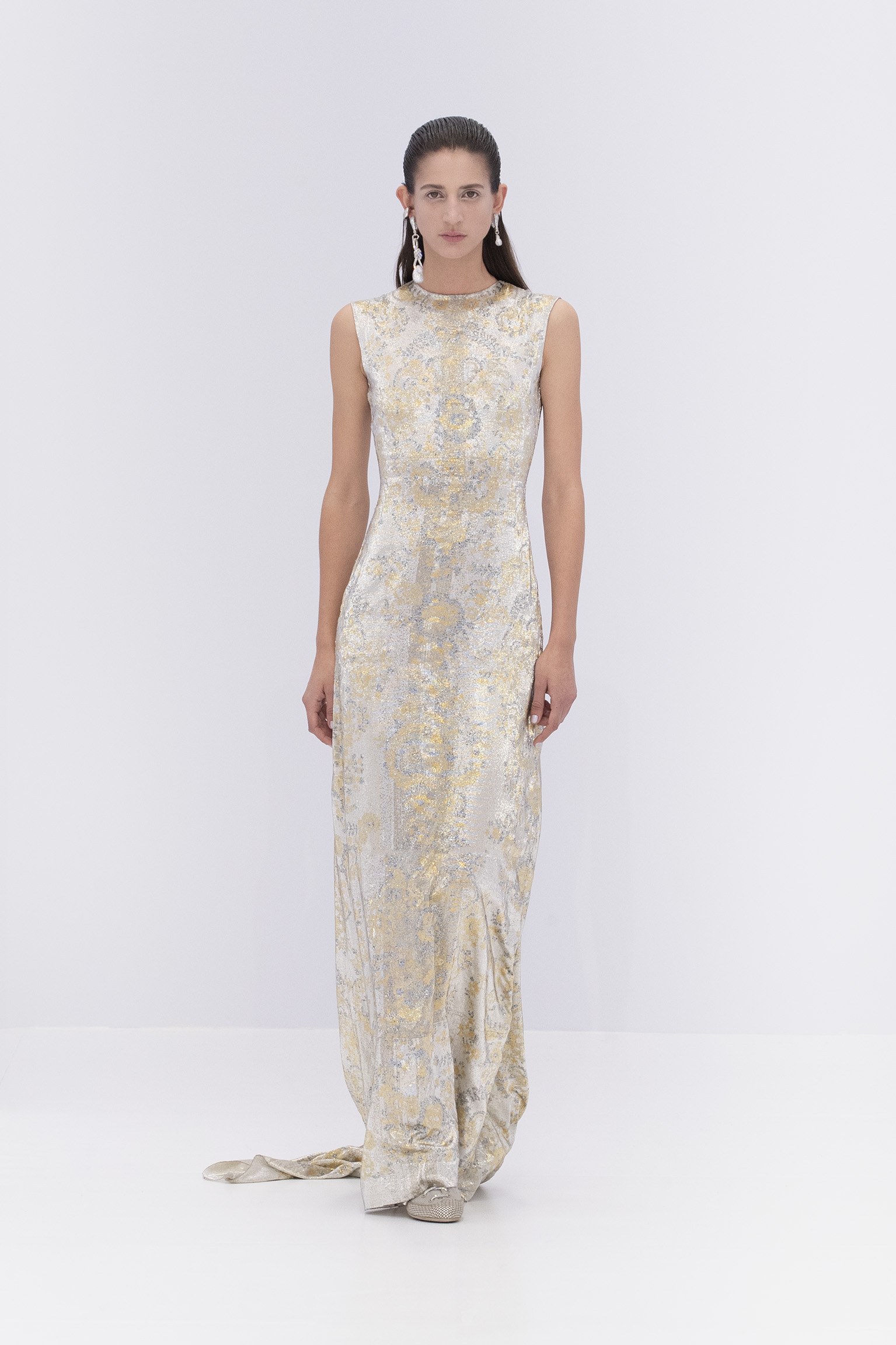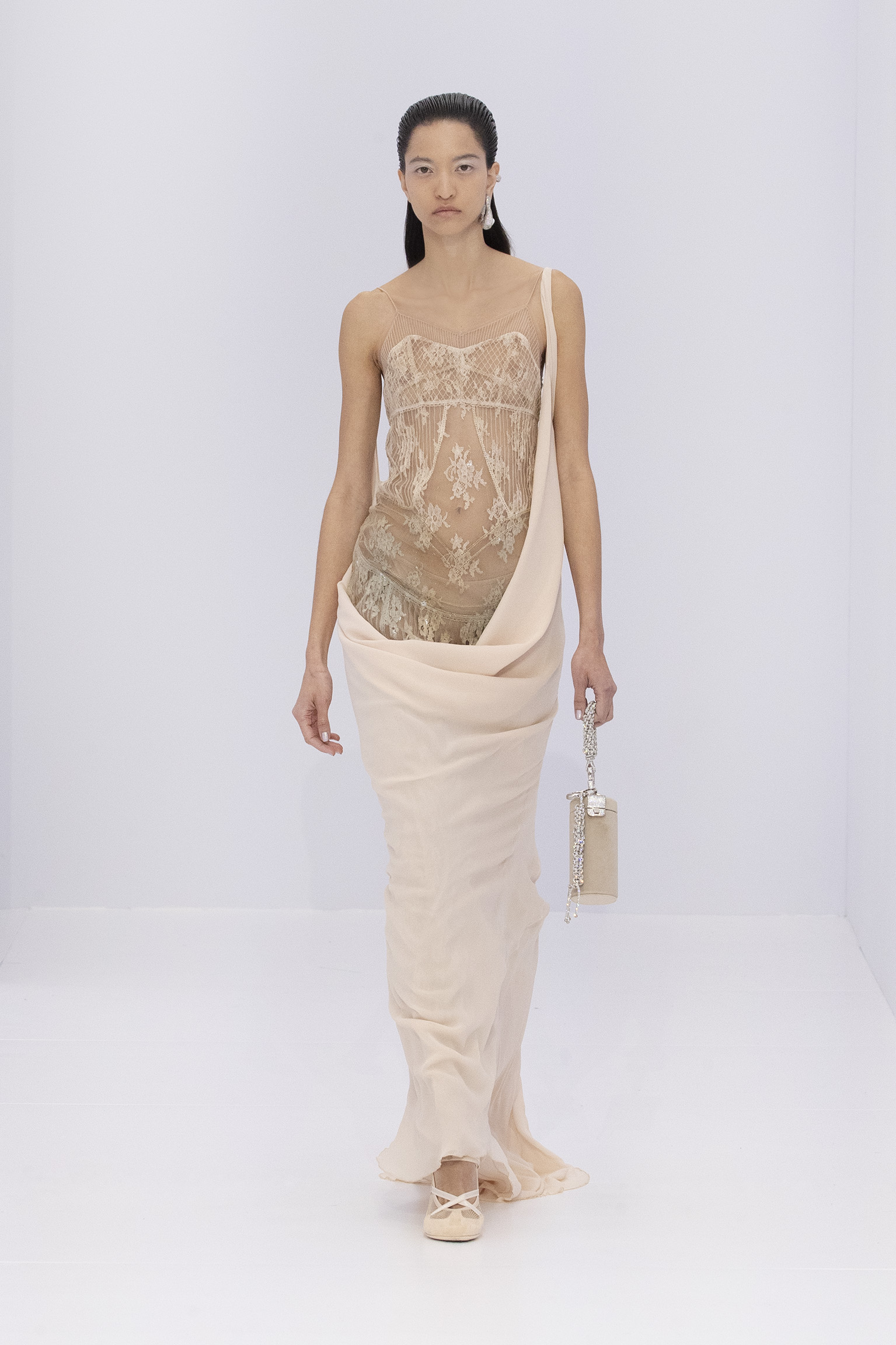 ด้วยเทคนิคการแดรปผ้าและพาดไปตามร่างกาย การดีไซน์ในการวางลายของลูกไม้ และการจับจีบด้วยมือ ยกระดับเสื้อผ้าด้วยเทคนิคการถักแบบพิเศษ ให้ความรู้สึกถึงธรรมชาติของงานประติมากรรม และในขณะเดียวกันก็แสดงให้เห็นถึง ความเป็นอัจฉริยะของ FENDI ในงานศิลปะแบบ sprezzatura ที่แม้แต่คาราบิเนอร์อุปกรณ์สำคัญสำหรับปีนเขายังต้องถูกสร้างมาใหม่เป็นประติมากรรมหรูหราเพื่อโยงวัสดุอย่างไม่แน่นหนามากนัก