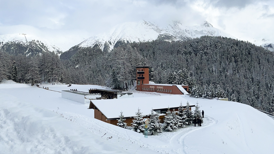 The Giorgio Armani Neve aut umn/winter 2022/23 was presented in St. Moritz yesterday with a show held at the space in front of the Olympia Stadium, the historic and evocative setting for two editions of the Winter Olympic Games (1928 and 1948), located just minutes from the city. The distinctive design perfectly matches the brand's style, making the space a natural theatre for the show and amplifying the surrounding scenery thanks to the existing structure with wooden seats, an external facade of mirrored panels and metal details in light gold.