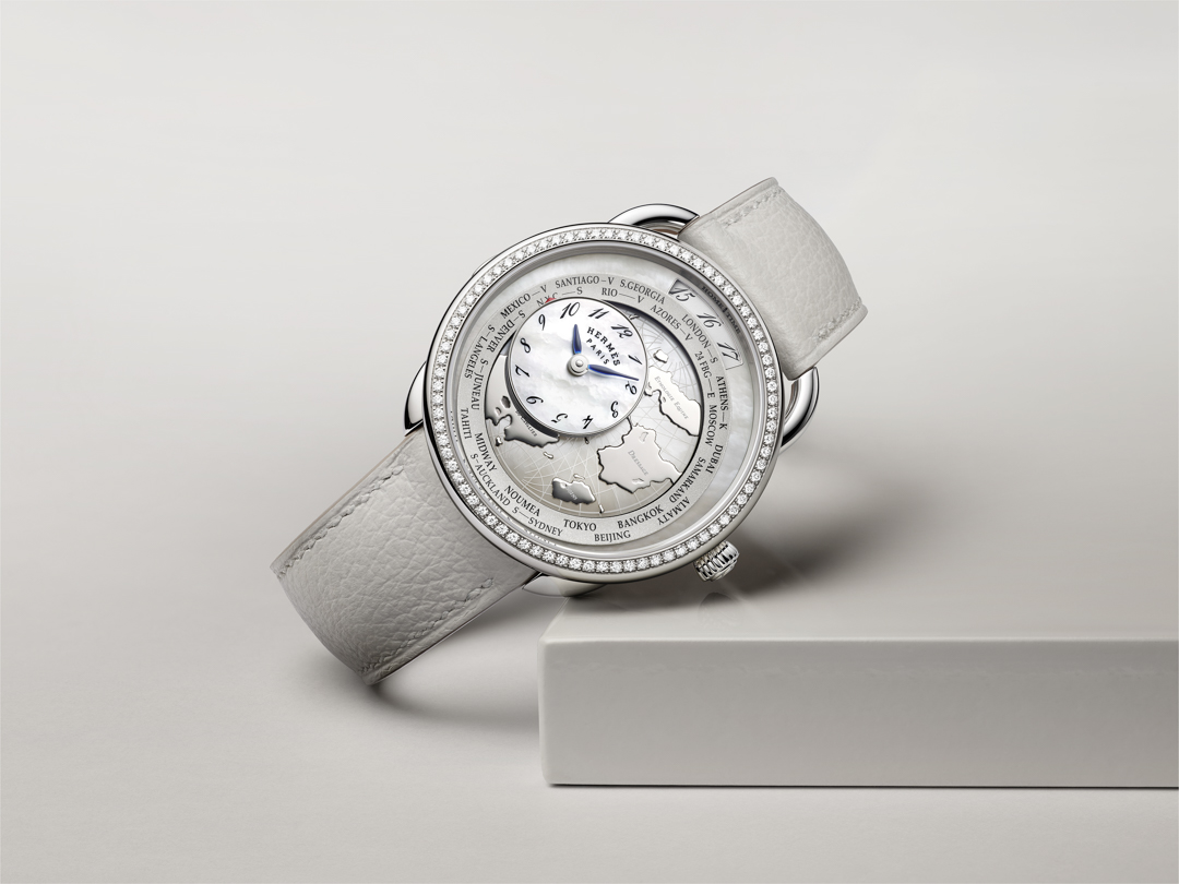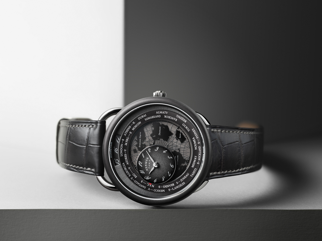 Against an intense black, deep blue or white mother-of-pearl background, the continents and meridians of this dreamlike universe stand out in relief and depth, adorned with subtle finishes: lacquered, openworked, sandblasted, sunburst, transferred or powdered silver-toned. A stylistic, functional and spiritual interpretation of a classic haute horlogerie complication, the unique «Travelling time» mechanism developed exclusively for Hermès displays 24 time zones by means of a circular disc. The mobile counter and the home-time indication at 12 o’clock are driven by an exclusive 122-component module, housed in a thickness of just 4.4 mm and integrated within the Hermès H1837 mechanical self- winding movement. The mechanism as a whole powers the display of hours, minutes and a dual- time display with city indication.