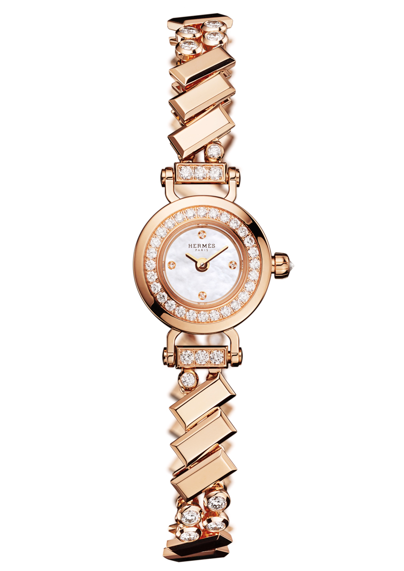 The miniaturised Faubourg model presented by Hermès in 2014 has inspired the quintessential design of the Faubourg Polka: a mother-of-pearl dial framed by a dainty round case. Its entirely redesigned bracelet consists of interwoven dots and oblique lines, as if its curves were going off on a tangent, as if its lines were wary of excessive straightness. It thus sets the pace of time with a sense of total freedom as its lines and dots invent a new language, whose punctuation and grammar tell the tale of a far-sighted present.