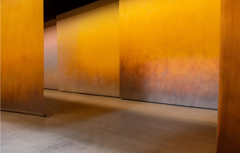 But I was able to participate in the visits of prospective spaces; I was also privy to the early plans for scenography. This was of utmost importance since it allowed me to plan and project. I began imagining these large paintings, the Panoramas (around six meters high and nine meters wide). There are twelve now, as well as five that are seven meters wide. The initial twelve are hung in a circular manner and move forward, sliding and overlapping. In layers. The others also move, but in different directions.
