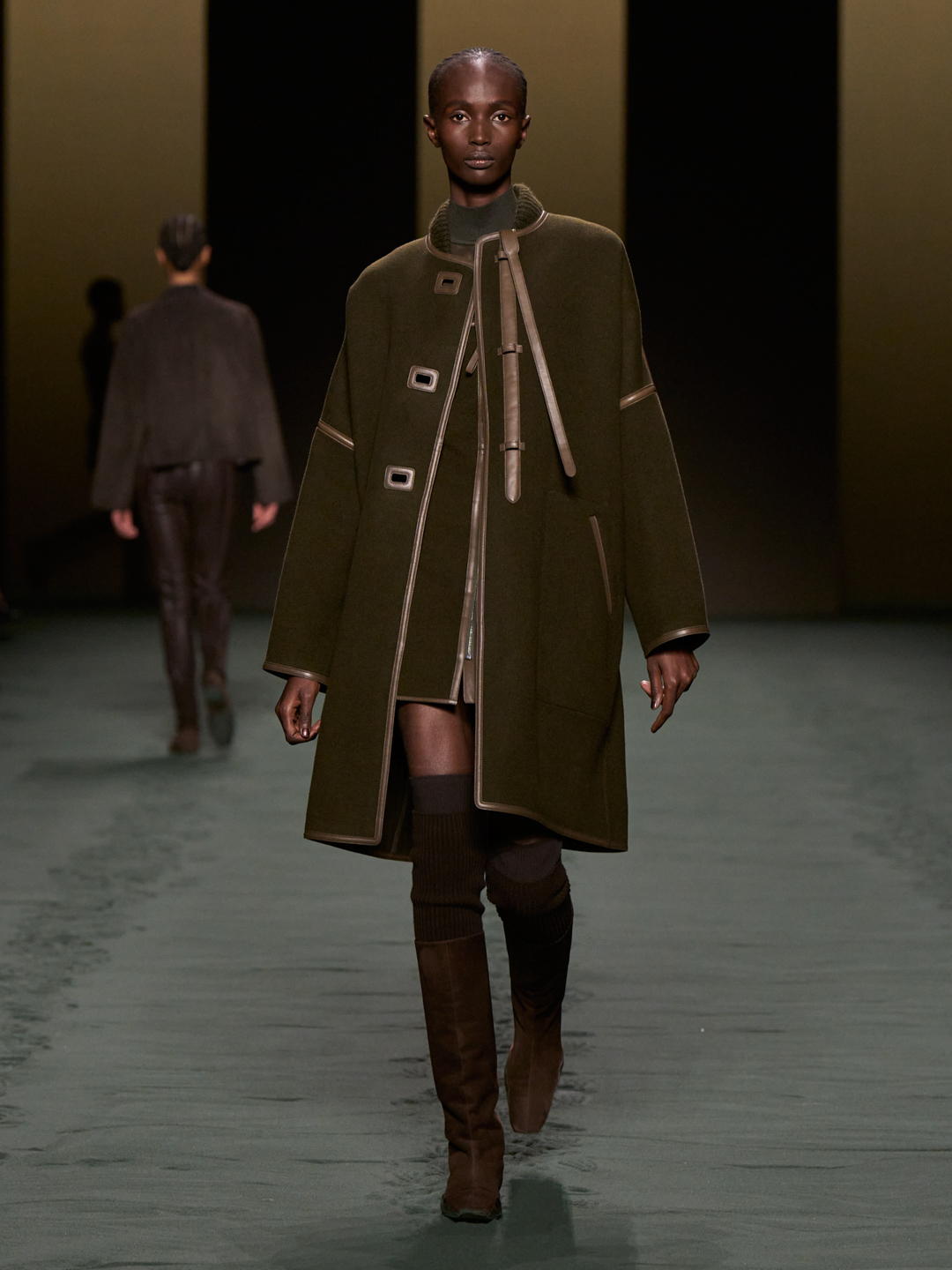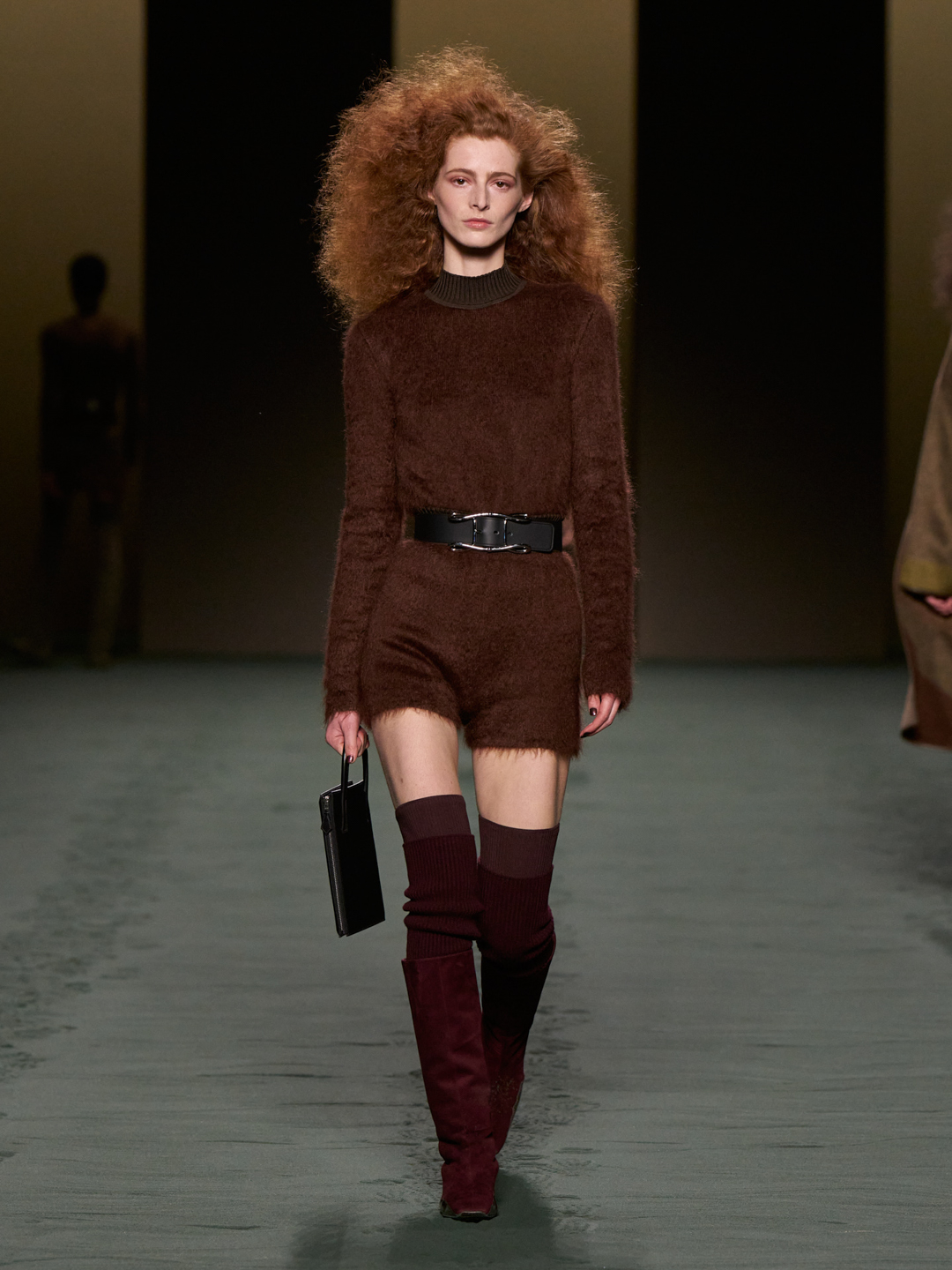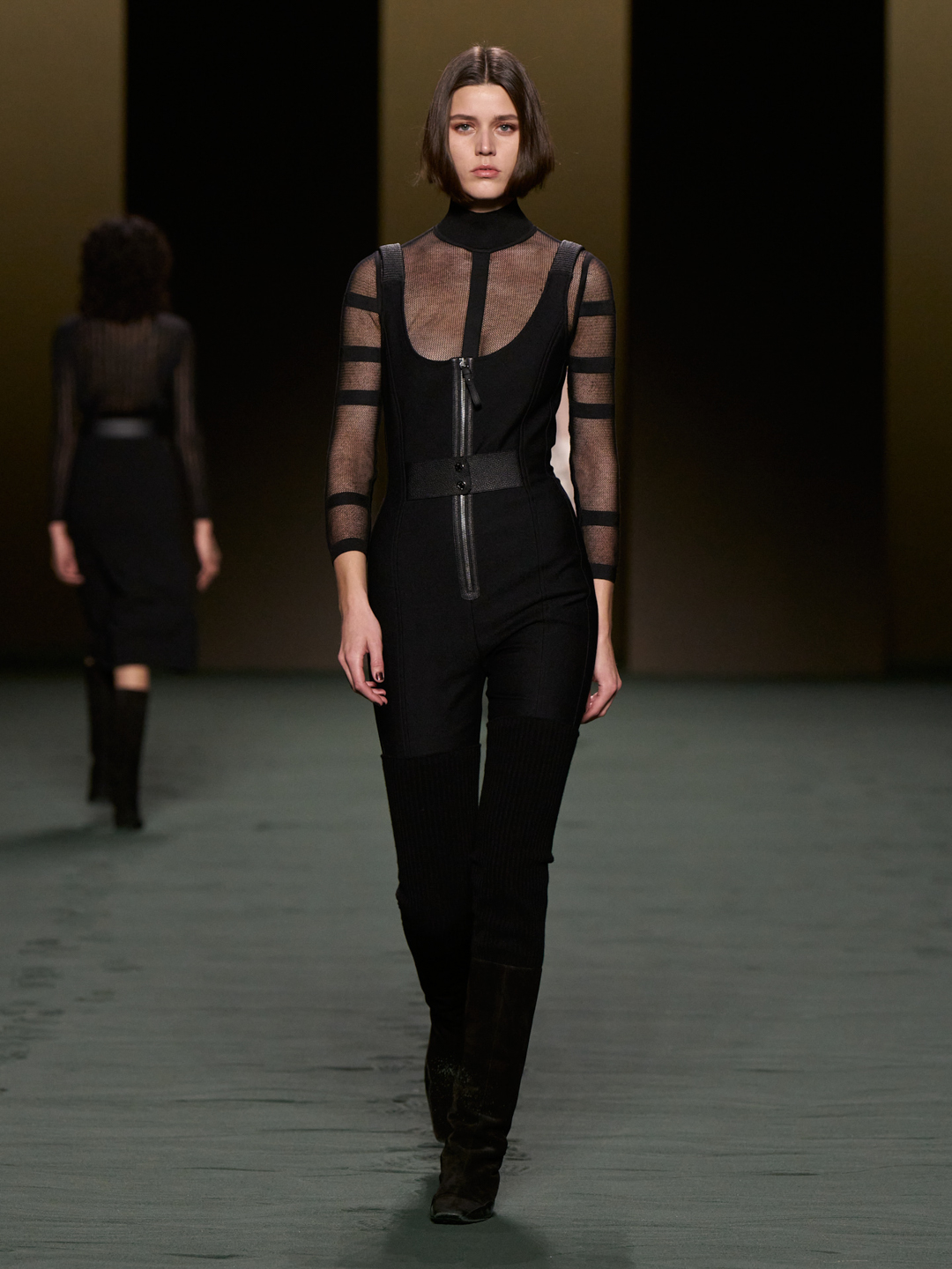 With a light step, she moves forward enfolded in a second skin knitwear that is a play on transparency. The chain on her belt makes a faint sound: is that a bell? The words, perhaps, are somewhat lacking. Then, as she walks by, an image comes to mind — something like the marriage of ancestral techniques and a future that has yet to take place: Equestrian Techno.