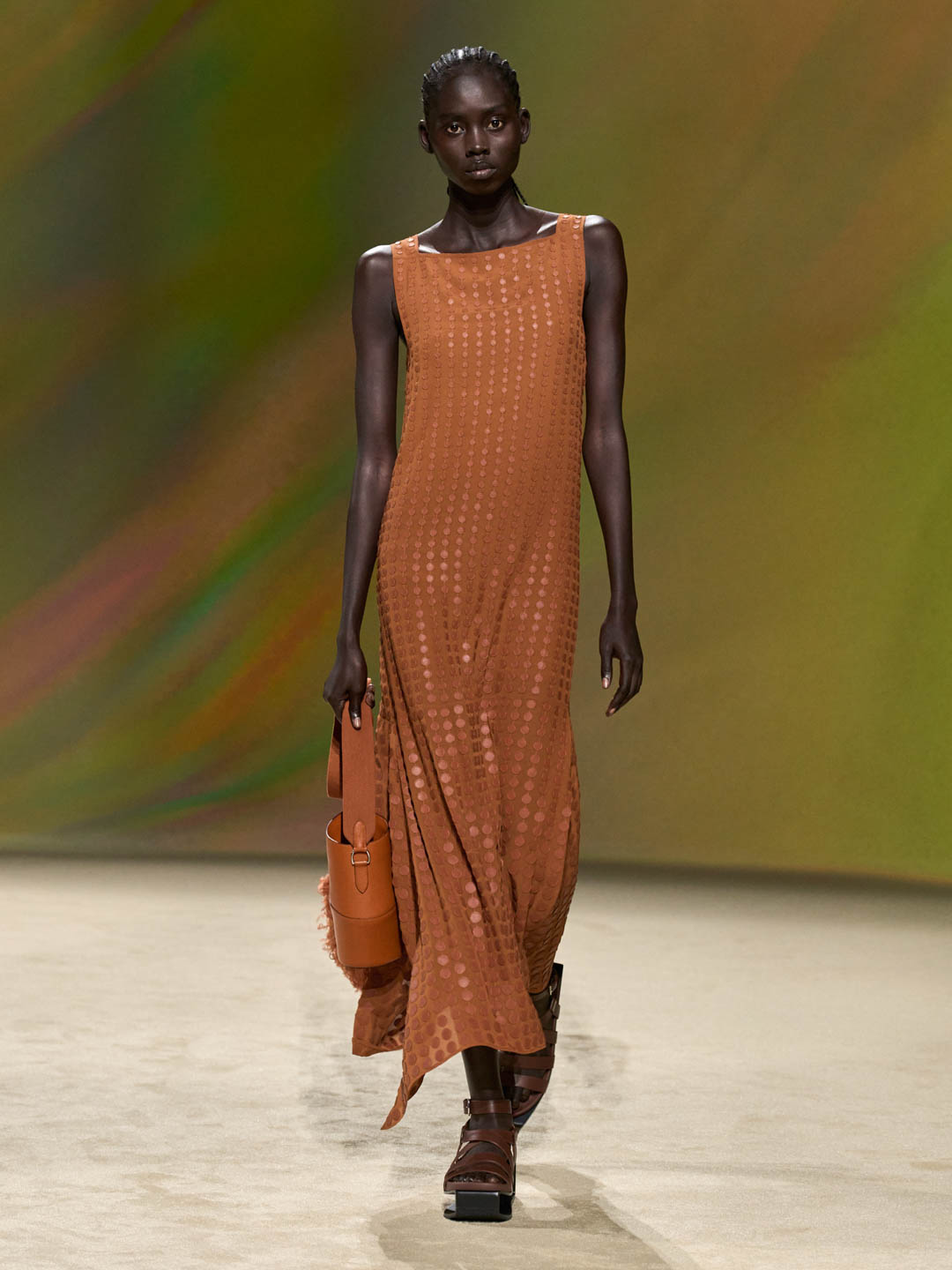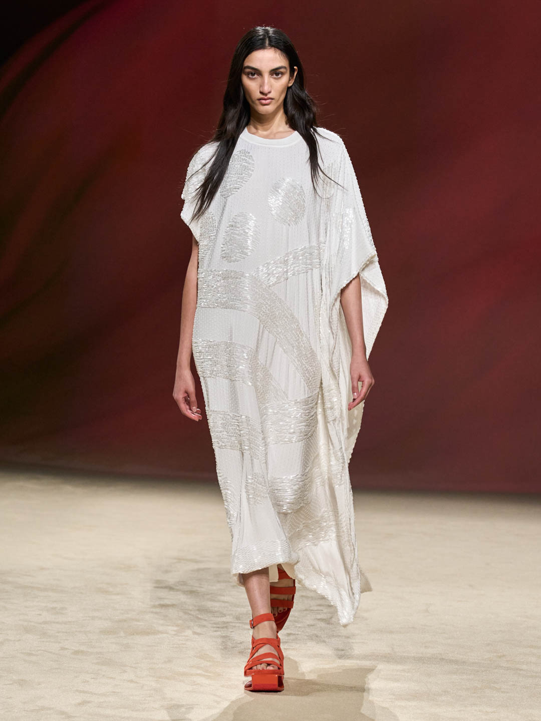 ในยามค่ำคืนอันงดงาม เธอห่มคลุมร่างกายด้วยชุดกระโปรงลายพิมพ์สามมิติ เชื่อมอย่างแนบเนียนเข้ากับการเคลื่อนไหวของเรือนร่างและรูปทรงของเธอ และเธอได้จดจำการเดินทางอันลึกซึ้งนี้ไว้อย่างมีความสุข