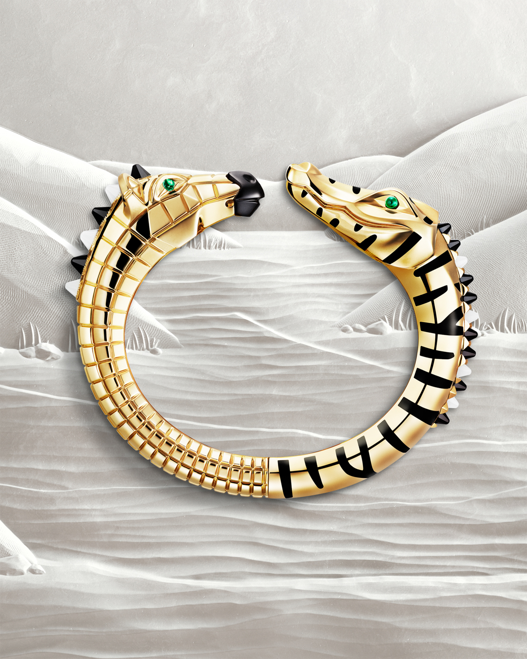 กำไลข้อมือทั้งหมดห้าแบบ มีให้เลือกทั้งแบบไวท์โกลด์ฝังเพชรหรือเยลโลโกลด์ล้วน สำหรับดีไซน์ไวท์โกลด์ประดับเพชรนั้น เสือจะเผชิญหน้ากับยีราฟ และจระเข้จะจ้องตากับม้าลาย ส่วนแบบเยลโลโกลด์ ม้าลายจะถูกจับคู่กับเสือแพนเตอร์หรือจระเข้ และเสือจะคู่กับยีราฟ