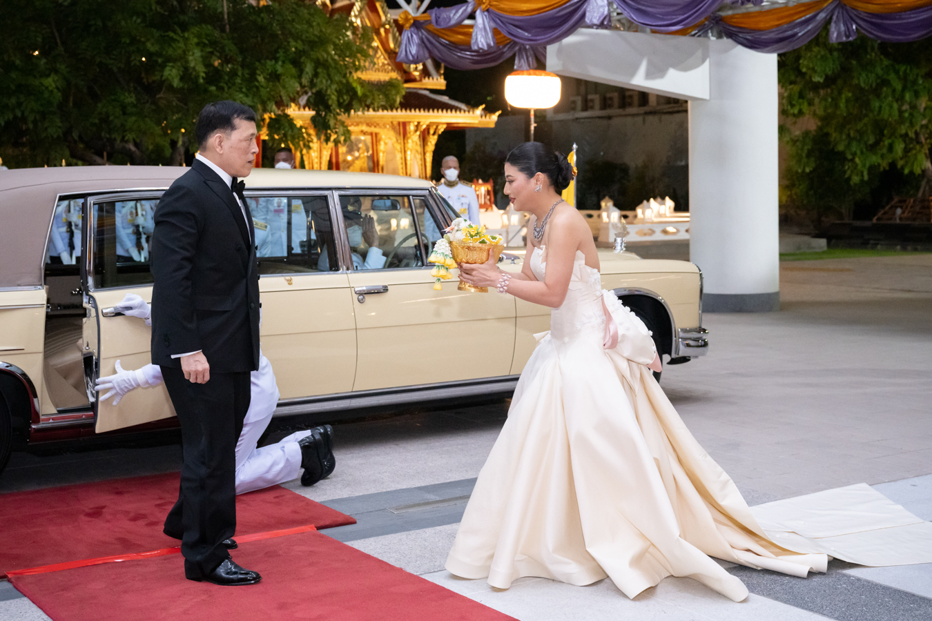 เครื่องแต่งกายชุดที่ 2 ประกอบด้วยเสื้อคลุมแจคการ์ด โทนสีทองอ่อนทอลายทั่วทั้งผืน ซึ่งดัดแปลงจากผลงานเสื้อผ้า คอลเลคชั่น Spring/Summer 2022 ที่ผ่านมาของแบรนด์ SIRIVANNAVARI และปักเพิ่มเติมอย่างประณีตเป็นรูปดอกโบตั๋นสามมิติบริเวณไหล่ทั้งสองข้างและหน้าอก