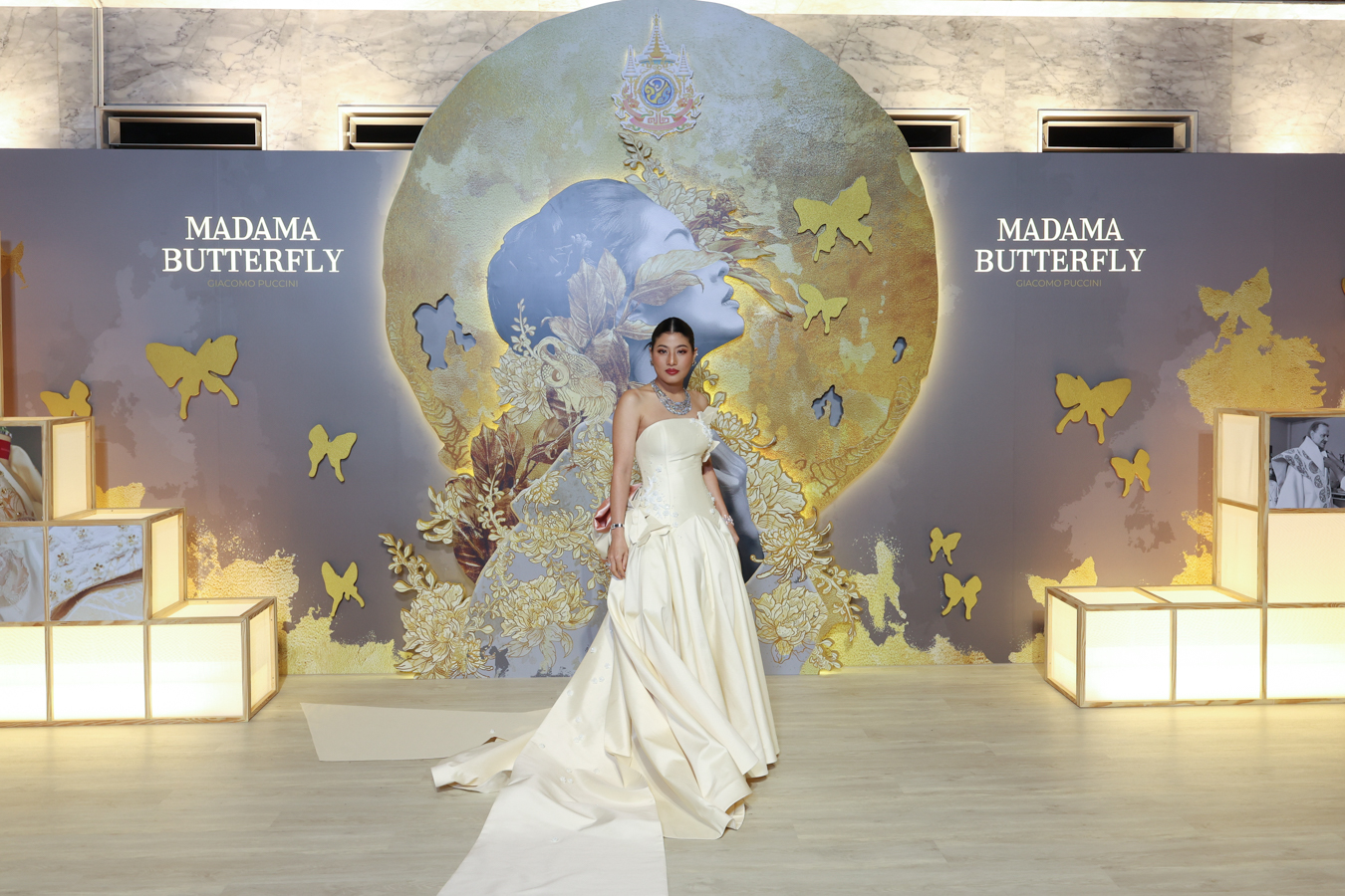 คณะนักแสดงจาก Opera Production ประกอบด้วยนักร้องโอเปร่าชั้นนำของยุโรป อาทิ Viktorija Miskunaite และ Laura del Rio นักร้อง Soprano รับบทเป็น Madama Butterfly, Gianluca Terranova (Tenor) รับบทเป็น B.F. Pinkerton, Alissandra Volpe (Mezzo-Soprano) รับบทเป็น Suzuki, Massimo Cavalletti (Baritone) รับบทเป็น Sharpless และ Orlando Polidoro (Tenor) ร่วมด้วย 3 นักร้องโอเปร่าชาวไทยที่มีชื่อเสียงในวงการ บรรเลงโดย Royal Bangkok Symphony Orchestra อำนวยเพลงโดย Valentin Egel ผู้อำนวยเพลงชาวเยอรมัน