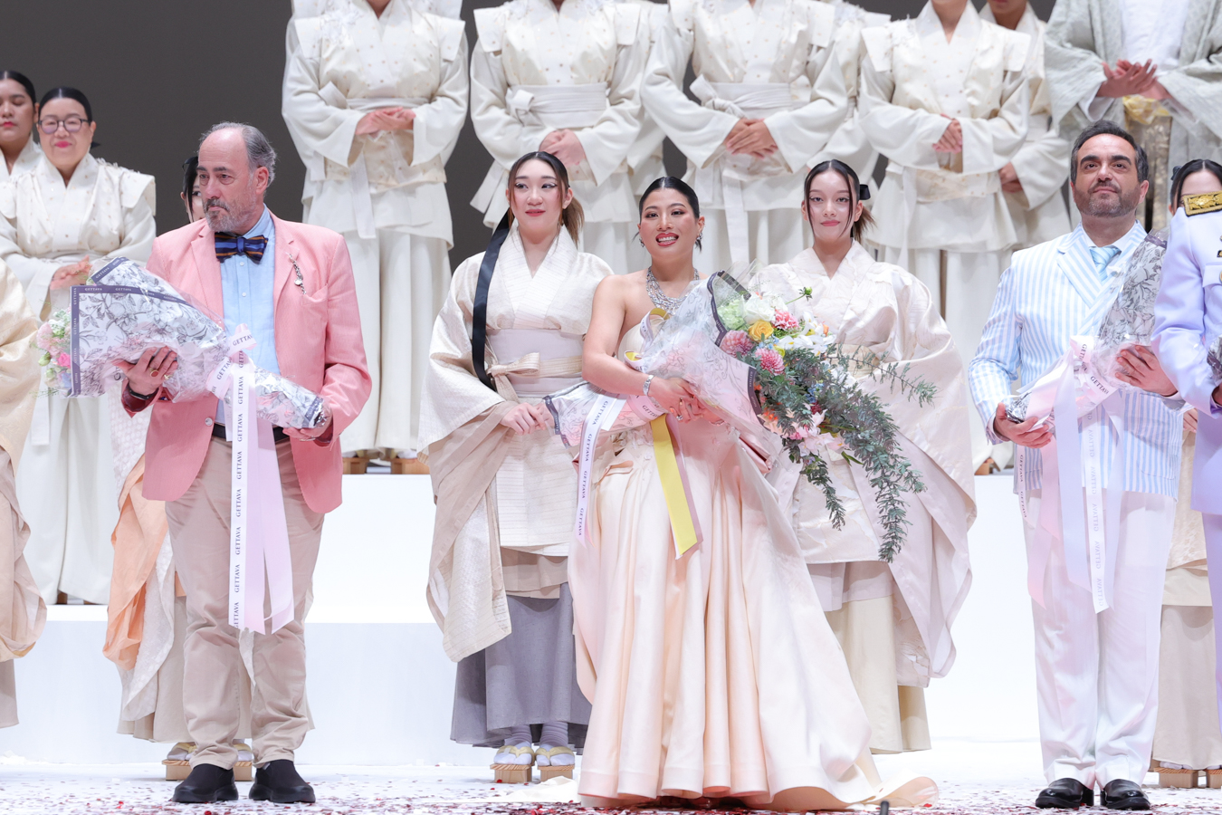 เครื่องแต่งกายสำหรับผู้รับบทเกอิชา ยังคงเต็มไปด้วยรายละเอียดอันพิถีพิถัน ในเรื่องประกอบด้วยเกอิชาทั้งหมด 6 คน แต่ละชุดมีองค์ประกอบที่เหมือนกันคือเสื้อคลุมตัวนอก เสื้อตัวใน กระโปรง โอบิ และโบว์ผูก ส่วนสีสันดูกลมกลืนกัน โดยตีความมาจากเสื้อผ้าของชุดหญิงชาวญี่ปุ่นตามขนบดั้งเดิม ลวดลายที่เรียงร้อยบนชุดของเกอิชาแต่ละคน มีความต่างกัน ทำให้เกิดเสน่ห์ และสร้างความตระการตาเมื่อเข้าฉากการแสดงที่เหล่าเกอิชามารวมตัวกัน