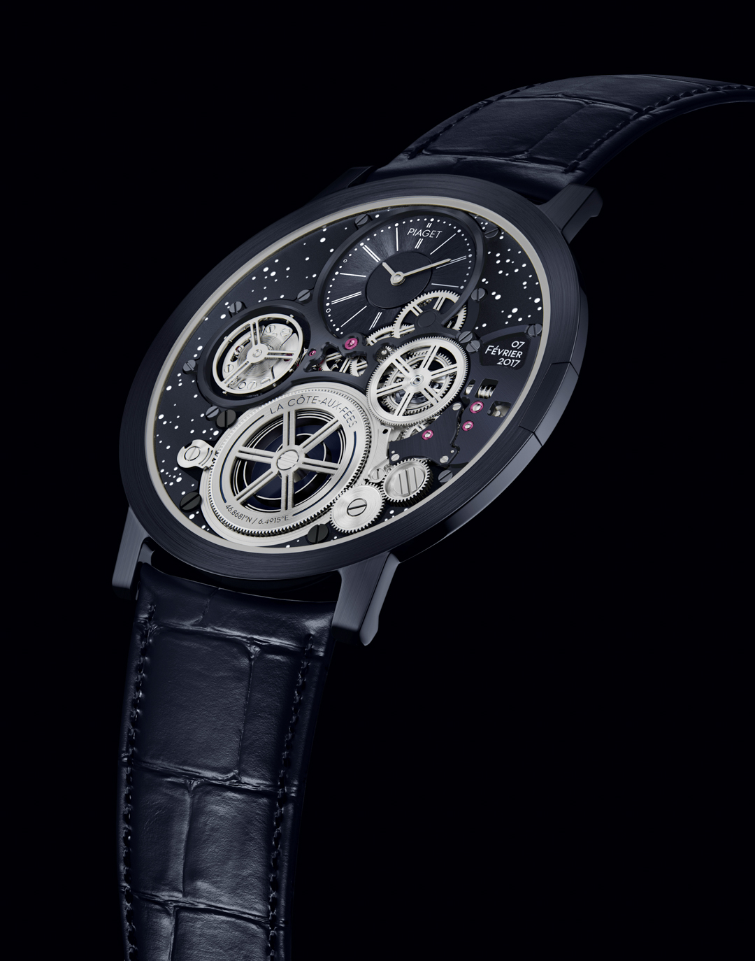Most timepieces are made up of four layers: 1) the bezel and crystal, 2) the dial and hands, 3) the movement, and 4) the case back. Piaget removed this four-layer construction to create a fusion of components with the bridges, dial, and hands, on one side, and the case back, movement, main plate and bezel on the other, all coming together as one. This fusion of watchmaking construction features five patents that have enabled the Maison to create a timepiece that is a mere 2mm in height, from the underside of the caseback to the top of the sapphire crystal.