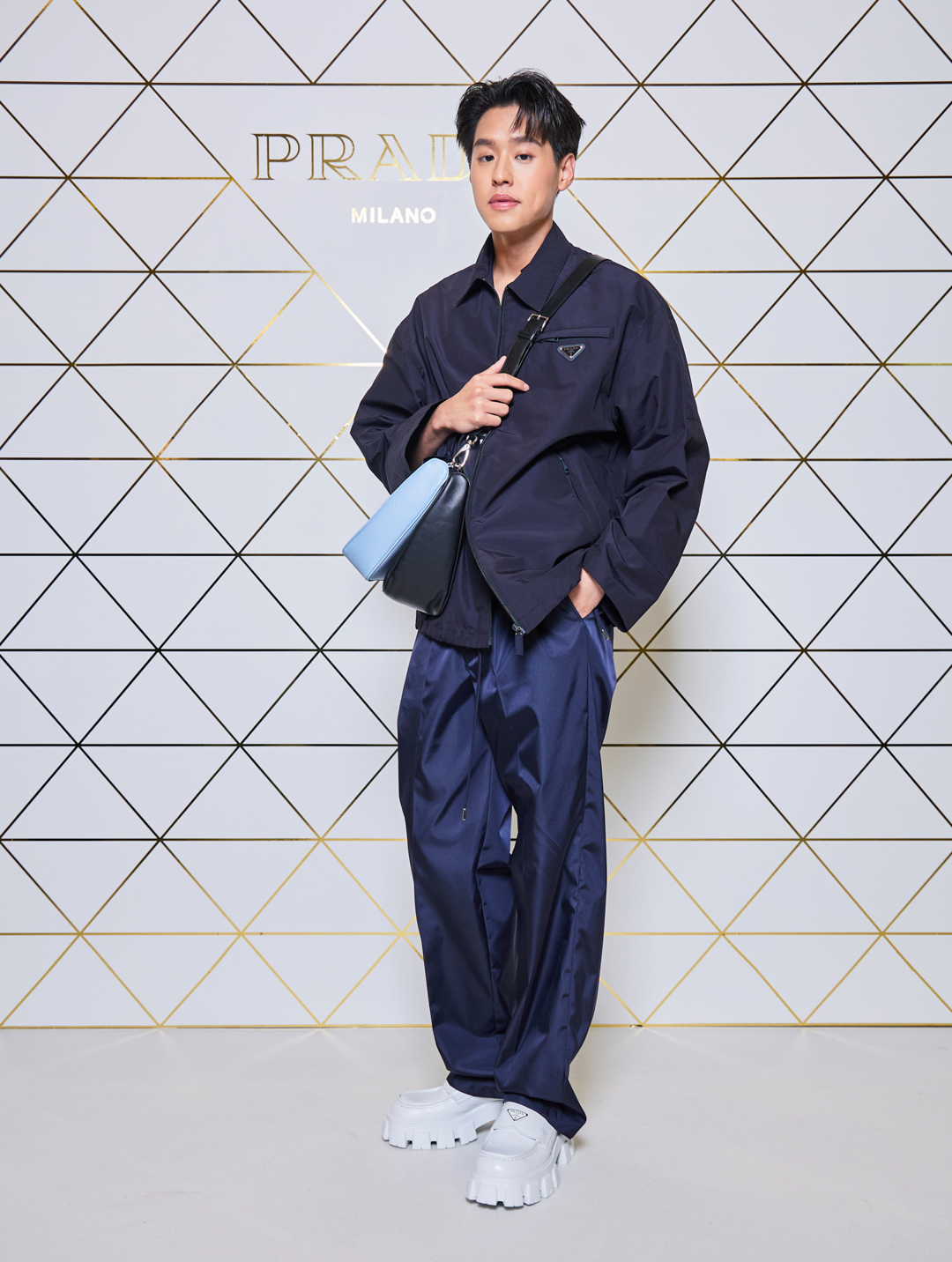 The pop up features Prada's iconic white and gold chequerboard flooring and the brand's triangle logo is reworked into the gold-coloured, geometric graphics on the walls.