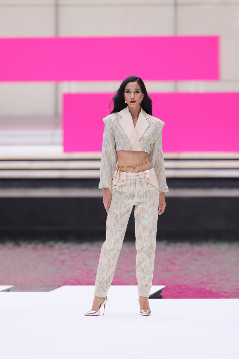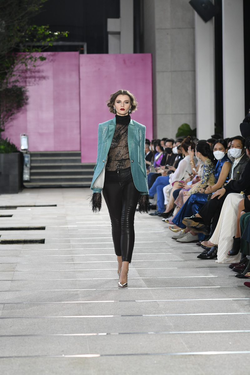 The spotlight shines on the marvelous embroidery, courtesy of the SIRIVANNAVARI Atelier and Academy. The exquisite craftsmanship of the Maison’s in-house workshop of couture embroidery is clearly visible, from the feather embellishment on the lace blouse, to the multicoloured beads, delicately embroidered upon the lime green cocktail dress.
