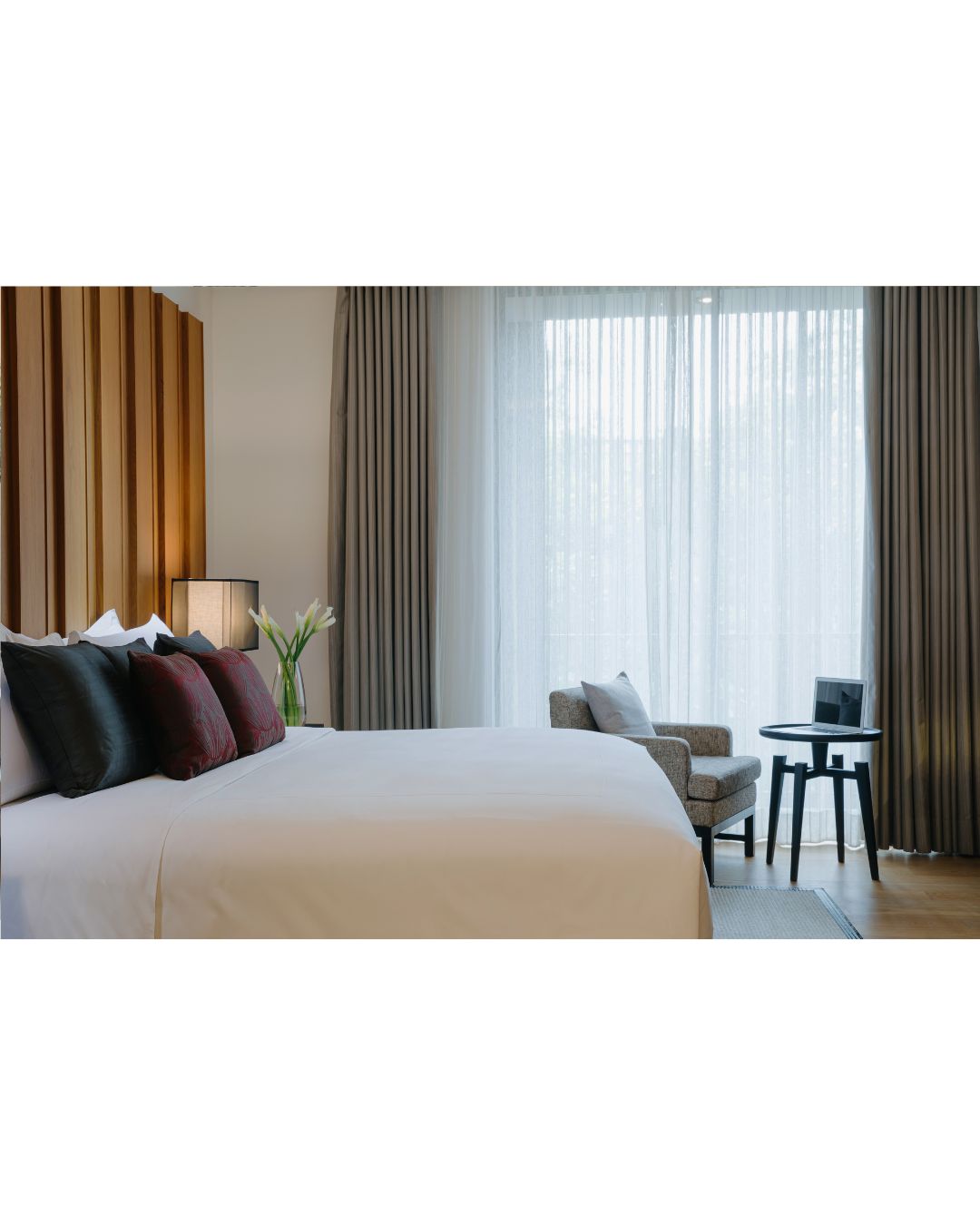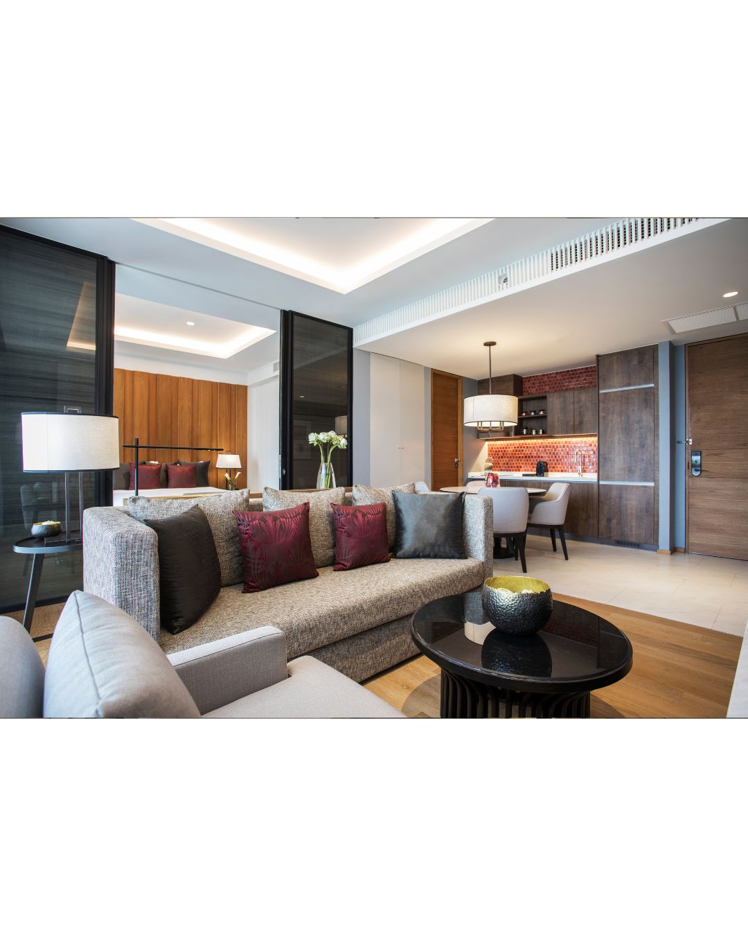 การออกแบบภายในของ อนันตรา เชียงใหม่ เซอร์วิส สวีทส์ สะท้อนความร่วมสมัยที่แฝงกลิ่นอายล้านนาอย่างสุขุม โทนสีอบอุ่นจากไม้ธรรมชาติ เส้นสายเฟอร์นิเจอร์ที่เรียบง่ายแต่พิถีพิถัน และผนังสีแดงอันเป็นเอกลักษณ์ของอนันตรา ช่วยสร้างบรรยากาศที่สงบ อบอุ่น และไม่เคร่งขรึม เพดานสูงและกระจกบานใหญ่เปิดรับแสงธรรมชาติ ทำให้พื้นที่ภายในดูโปร่ง โล่ง และเชื่อมต่อกับภายนอกอย่างเป็นธรรมชาติ ความงามจึงไม่ได้เกิดจากการประดับประดาที่หวือหวา หากค่อย ๆ เผยตัวผ่านสัดส่วน แสง และรายละเอียดที่ถูกคิดมาอย่างรอบคอบ