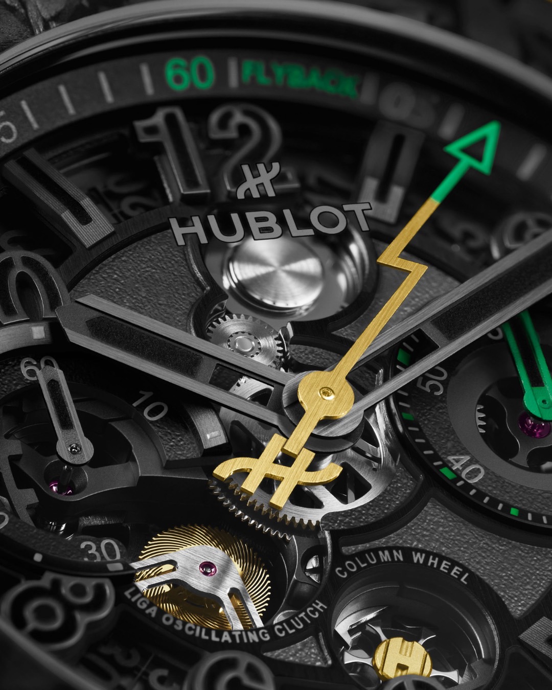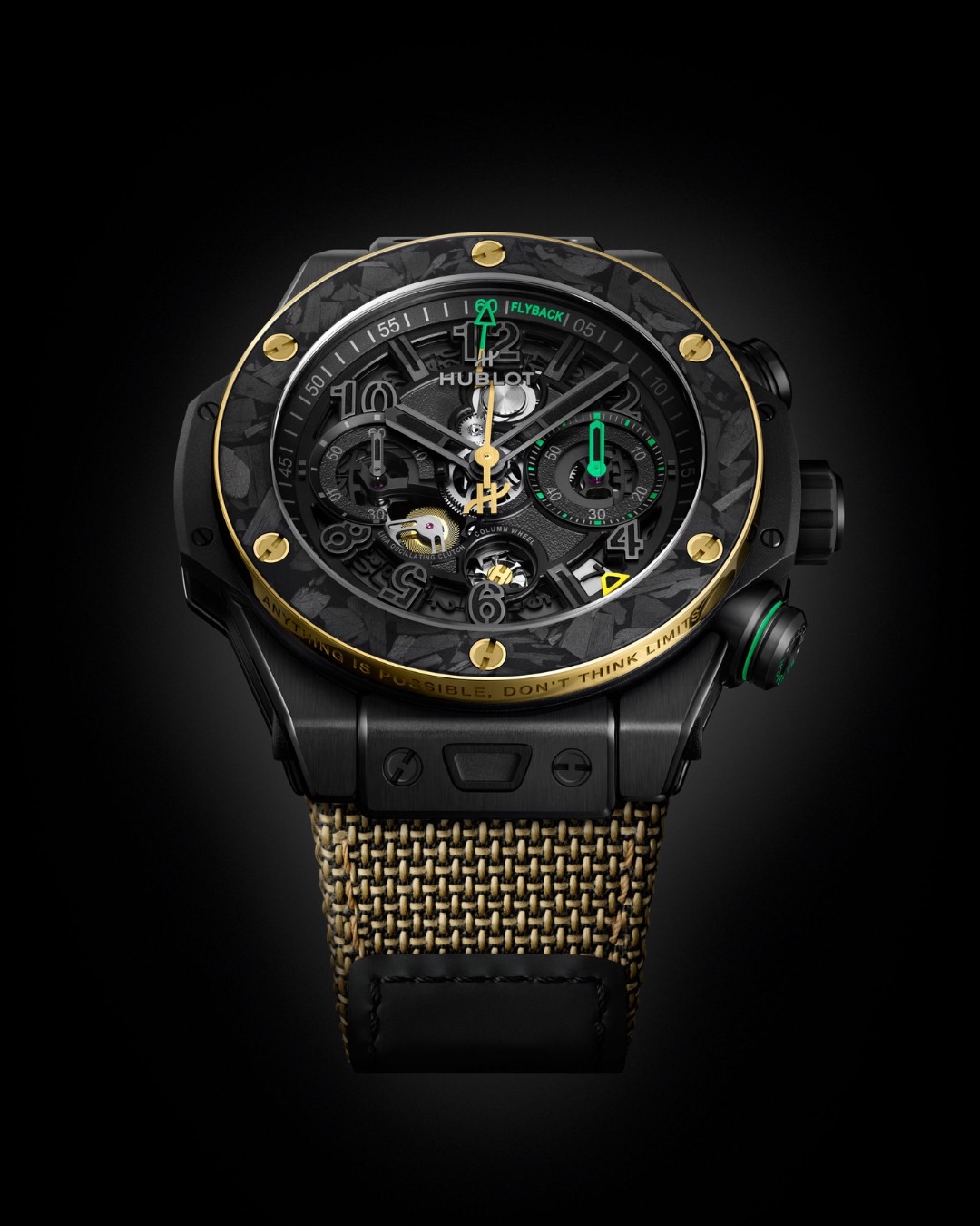 ในอีกด้าน บิ๊ก แบง รีโหลด ยูเซน โบลต์ (Big Bang Reloaded Usain Bolt) กลับเล่าเรื่องของความเชื่อและการก้าวข้ามขีดจำกัด ผ่านตัวเรือนสีดำและทองที่สะท้อนรากเหง้าจากจาเมกา พร้อมรายละเอียดเชิงสัญลักษณ์อย่างตัวเลข 9.58 ที่ซ่อนอยู่ในหน้าปัด และองค์ประกอบที่บรรจุเรื่องราวชีวิตของ โบลต์ (Bolt) ไว้อย่างลึกซึ้ง