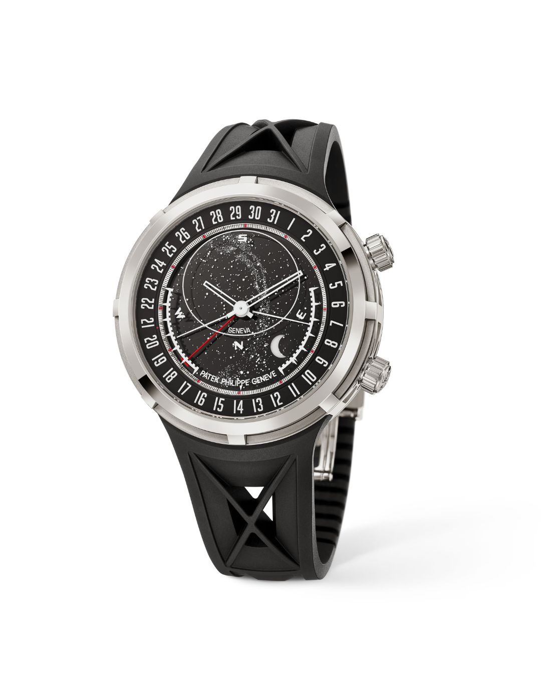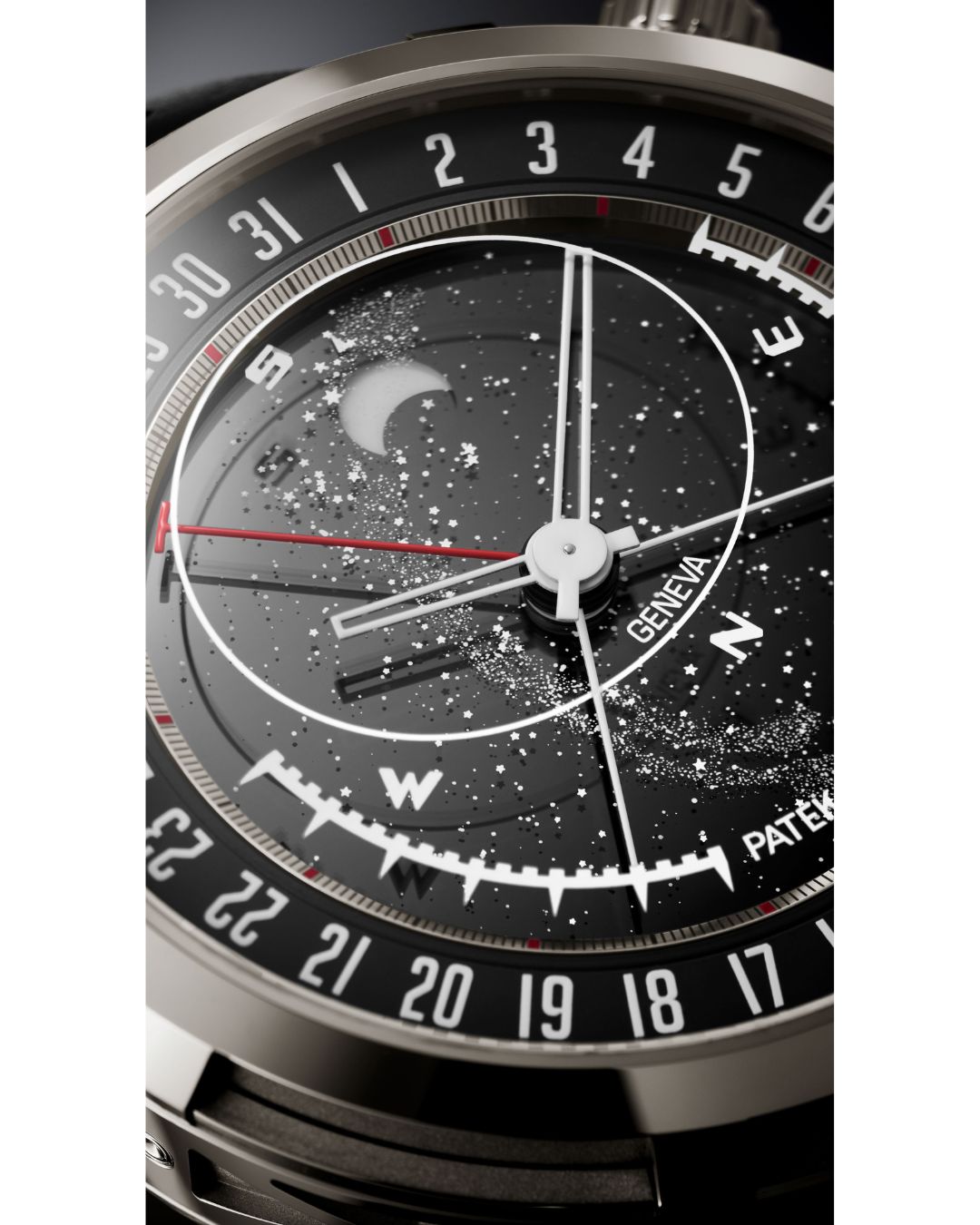 ท่ามกลางการเฉลิมฉลองไอคอนของแบรนด์ Patek Philippe ยังตอกย้ำศักยภาพด้านนวัตกรรมด้วย Ref. 6105G-001 นาฬิกาที่มีฟังก์ชันซับซ้อนระดับสูงหลายระบบ (Grand Complication) รุ่นแรกที่สามารถแสดงเวลาพระอาทิตย์ขึ้นและตกได้ โดยผสานดีไซน์สเปซเอจเข้ากับศาสตร์นาฬิกาชั้นสูง ตัวเรือนไวต์โกลด์ขนาด 47 มม. โดดเด่นด้วยพื้นผิวขัดเงาสลับทรายพ่น และหน้าปัดกระจกแซฟไฟร์ที่ถ่ายทอดภาพท้องฟ้าเหนือกรุงเจนีวาอย่างแม่นยำ ขับเคลื่อนด้วยกลไกอัตโนมัติคาลิเบอร์ 240 C LU CL LCSO พร้อมมินิโรเตอร์ทอง 22K ซึ่งสามารถแสดงทั้งพระอาทิตย์ขึ้น–ตก รวมถึงปรับเวลาแบบฤดูร้อน–ฤดูหนาวได้ในระบบเดียว อีกทั้งยังมีการยื่นจดสิทธิบัตรถึง 6 รายการ และให้พลังงานสำรองราว 48 ชั่วโมง สะท้อนความก้าวหน้าทางเทคนิคของเมซงอย่างชัดเจน