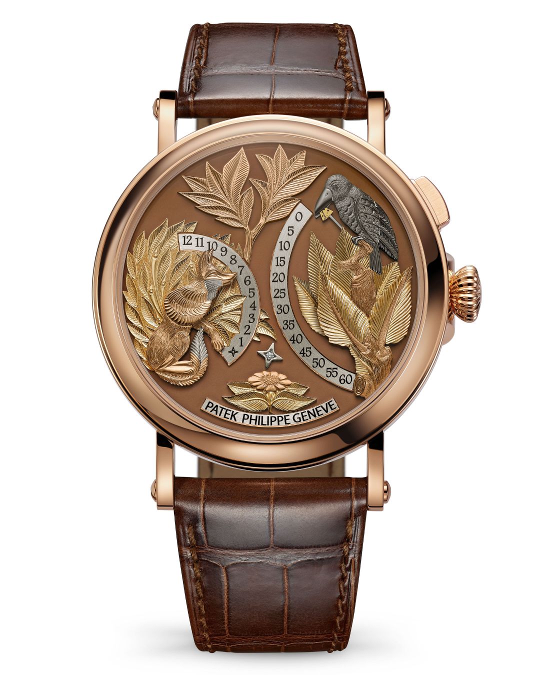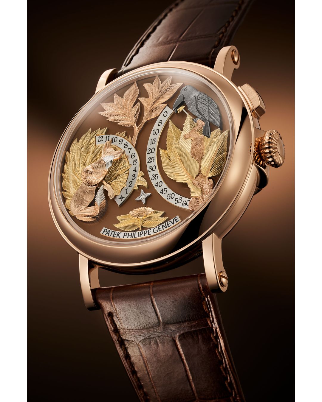 ปิดท้ายด้วย Ref. 5249R-001อีกากับสุนัขจิ้งจอก (The Crow and the Fox) นาฬิกาออโตมาตอนข้อมือรุ่นแรกในยุคใหม่ของ Patek Philippe ที่หลอมรวมศิลปะการเล่าเรื่องเข้ากับกลไกชั้นสูงได้อย่างงดงาม ตัวเรือนโรสโกลด์ขนาด 43 มม. มาพร้อมหน้าปัดพื้นผิวหน้าปัดโทนน้ำตาลแบบโอปาลีน (Matara brown opaline) ที่ถ่ายทอดฉากนิทานผ่านฟิกเกอร์ทอง “อีกาและสุนัขจิ้งจอก” แบบสามมิติ แกะสลักด้วยมืออย่างประณีต กลไกสามารถแสดงเวลาแบบทำงานเมื่อผู้ใช้สั่ง ผ่านระบบเรโทรเกรด (retrograde) พร้อมขับเคลื่อนการเคลื่อนไหวของฉากออโตมาตอน (automaton) โดยใช้คาลิเบอร์ 31-260 PS HMD AU ที่ประกอบด้วย 267 ชิ้นส่วน และมินิโรเตอร์แพลทินัม ให้พลังงานสำรองประมาณ 38–48 ชั่วโมง เผยความงดงามของกลไกผ่านฝาหลังแซฟไฟร์ และเสริมความหรูด้วยสายหนังอัลลิเกเตอร์ สีน้ำตาลช็อกโกแลต