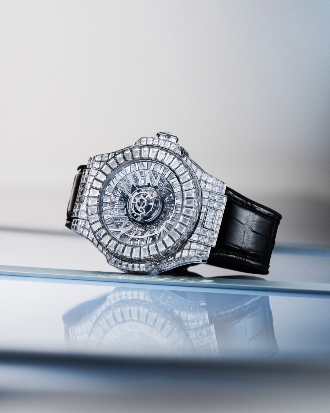 อีกหนึ่งก้าวสำคัญคือ สปิริต ออฟ บิ๊ก แบง อิมแพคต์ (Spirit of Big Bang Impact) ที่สะท้อนความกล้าทางเทคนิคอย่างแท้จริง ด้วยการนำเพชรฝังลงบนวัสดุแซฟไฟร์เป็นครั้งแรก ความท้าทายของการทำงานกับหนึ่งในวัสดุที่แข็งที่สุดในโลก ถูกแปรเปลี่ยนเป็นงานออกแบบที่ทั้งทรงพลังและงดงาม โครงสร้างแบบแตกกระจายถูกถ่ายทอดผ่านตัวเรือนโปร่งใส สร้างมิติใหม่ของการมองเห็นกลไกภายใน